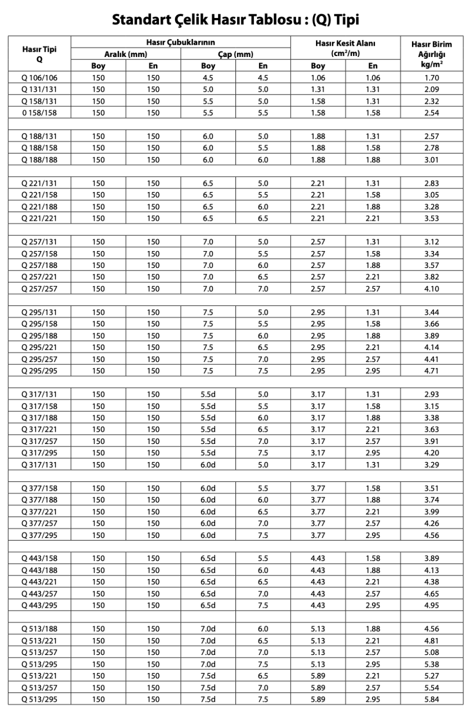 Standart Çelik Hasır Tablosu: (Q) Tipi