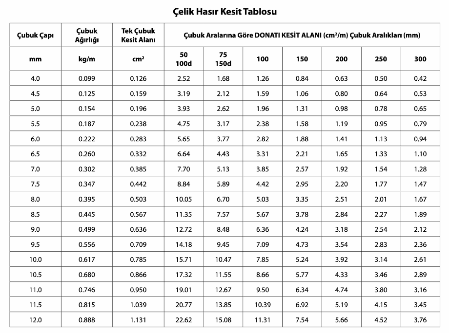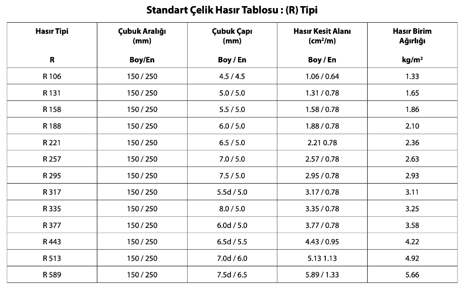 Standart Çelik Hasır Tablosu: (R) Tipi